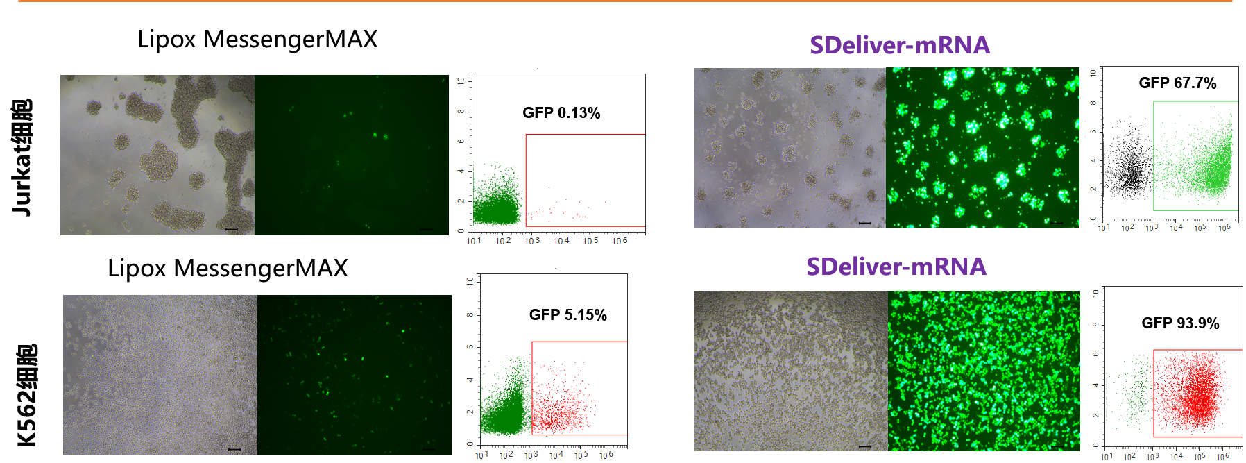 SDeliver-mRNA的优势:在广泛细胞类型中达到极高的转染效率,尤其是对免疫细胞、神经元、干细胞和原代细胞等难转染细胞,表现出很高的均一性。