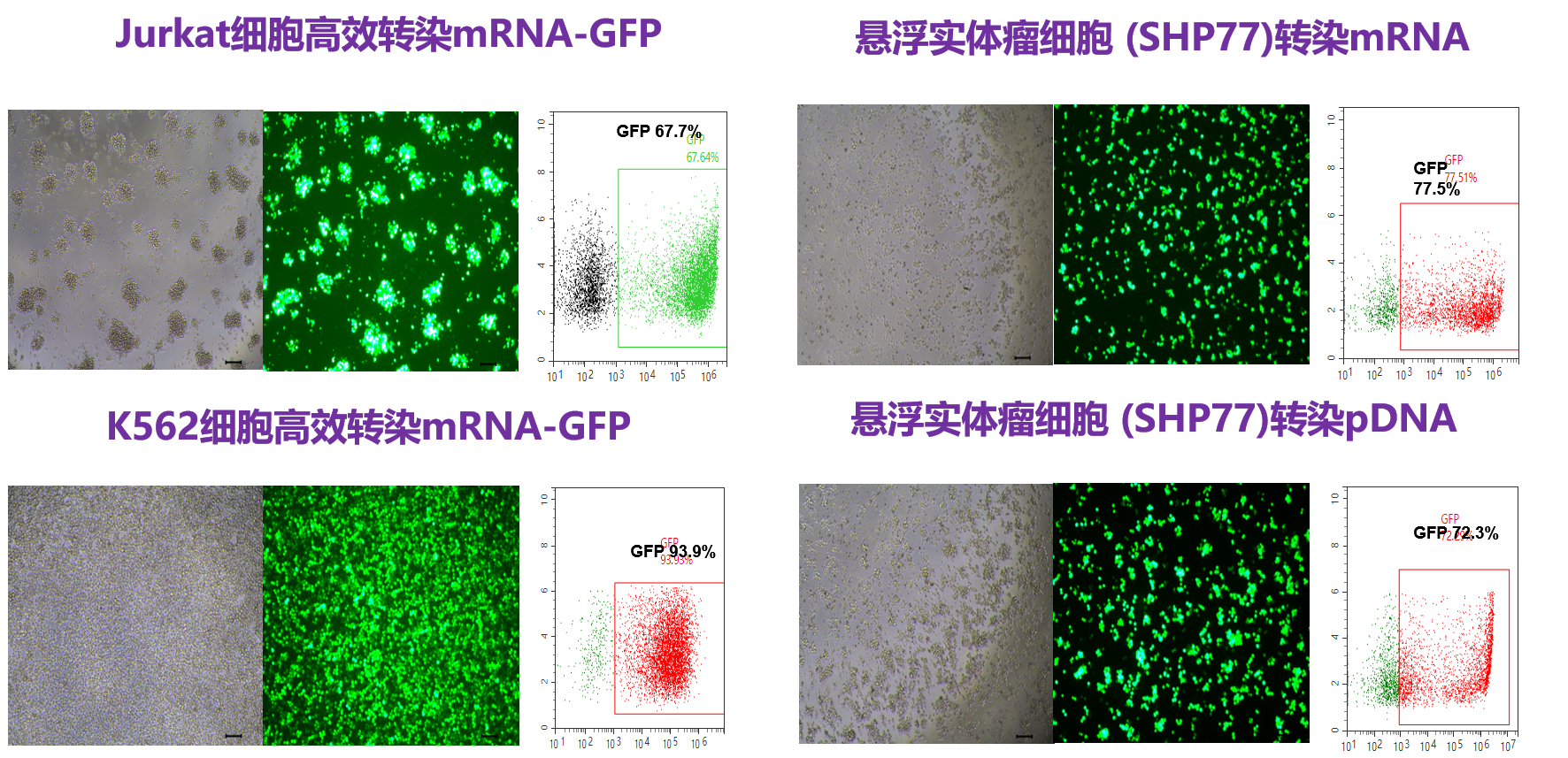 首次尝试时,建议设置阳性对照组(mRNA-GFP/pDNA-GFP),以检测实验操作和试剂的有效性。参考转 染体系推荐表,使用96孔的细胞量即可,节省细胞和试剂。